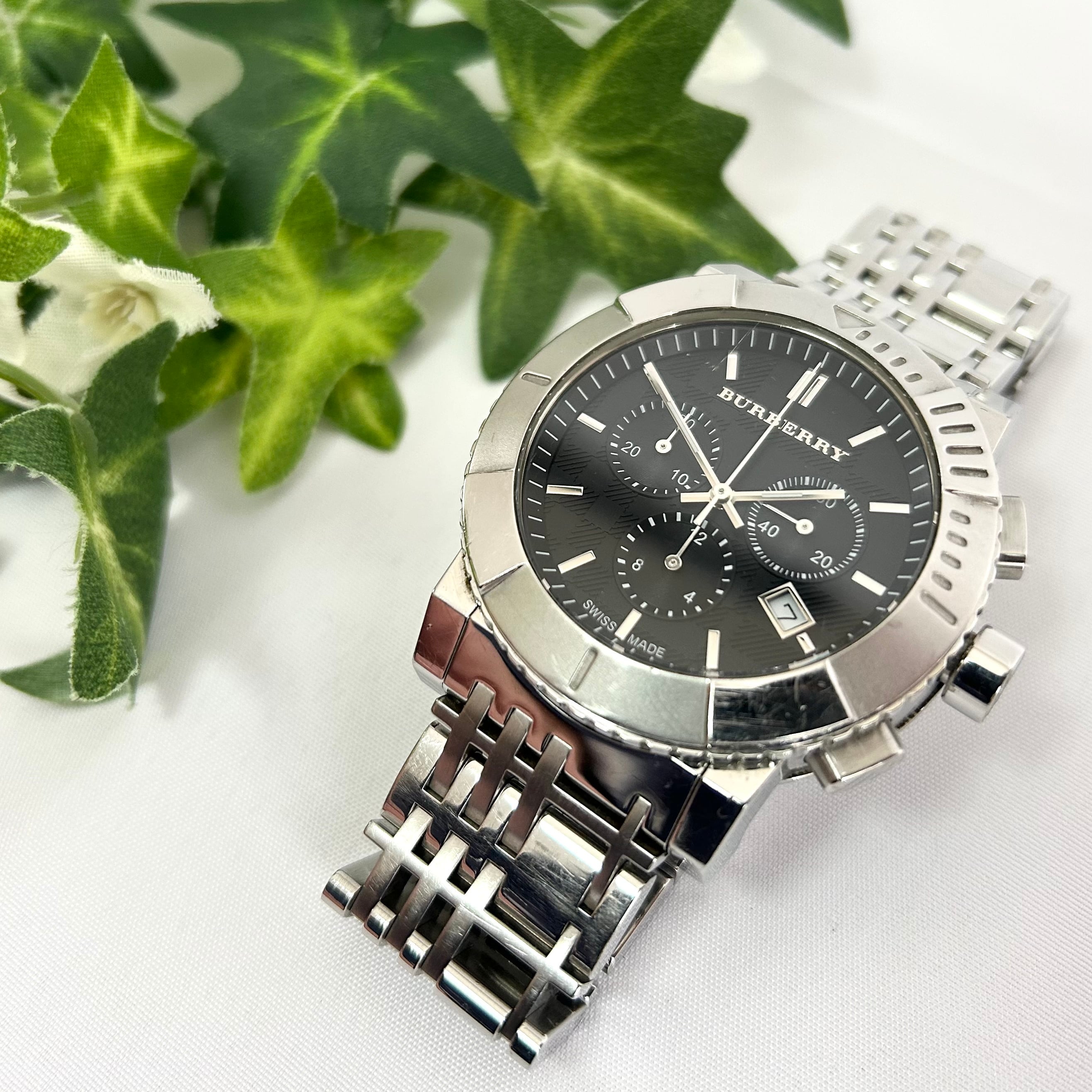 良品 BURBERRY バーバリー クロノグラフ メンズ 腕時計 クォーツ SS ブラック文字盤