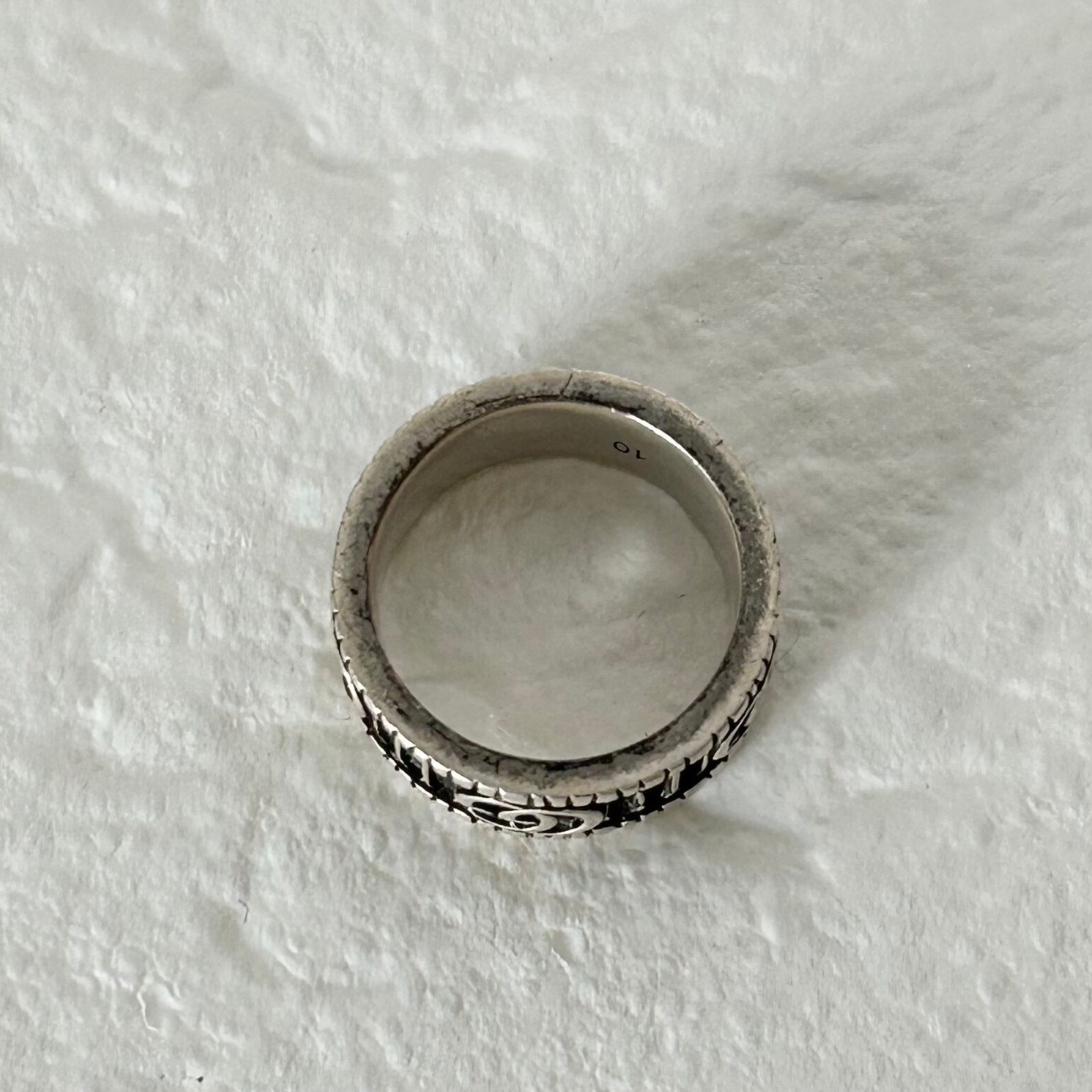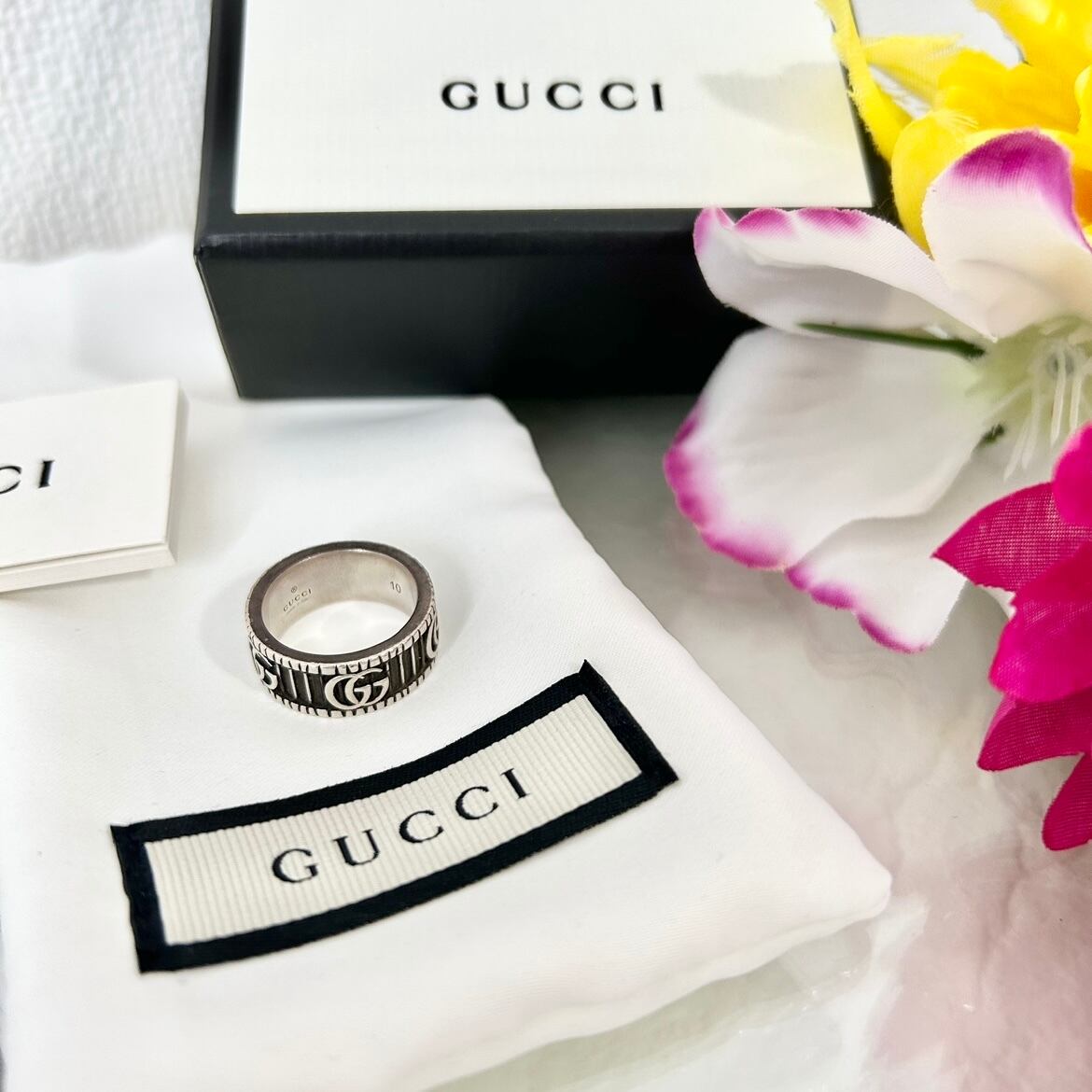 洗練されたデザインと高品質なシルバー925の純度で作られています。ダブルGのシンボルがリングに華やかに輝き、存在感を放ちます。10号のサイズは、男性・女性共にしっかりとしたフィット感を提供します。